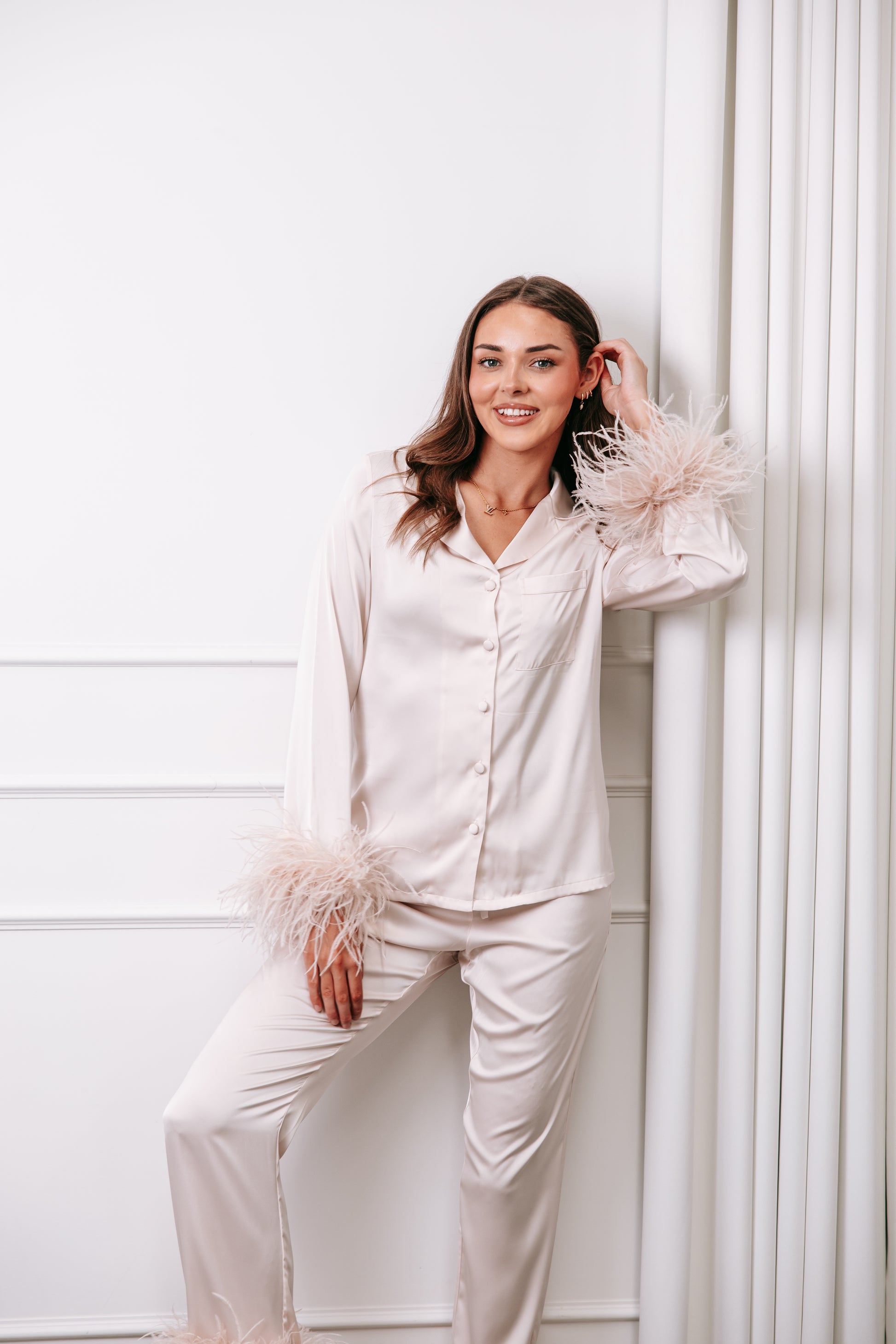 Your new it-girl PJs. Made from silky blush satin and finished with dreamy feather cuffs, this set is designed for nights in, champagne toasts, and every luxe moment in between.